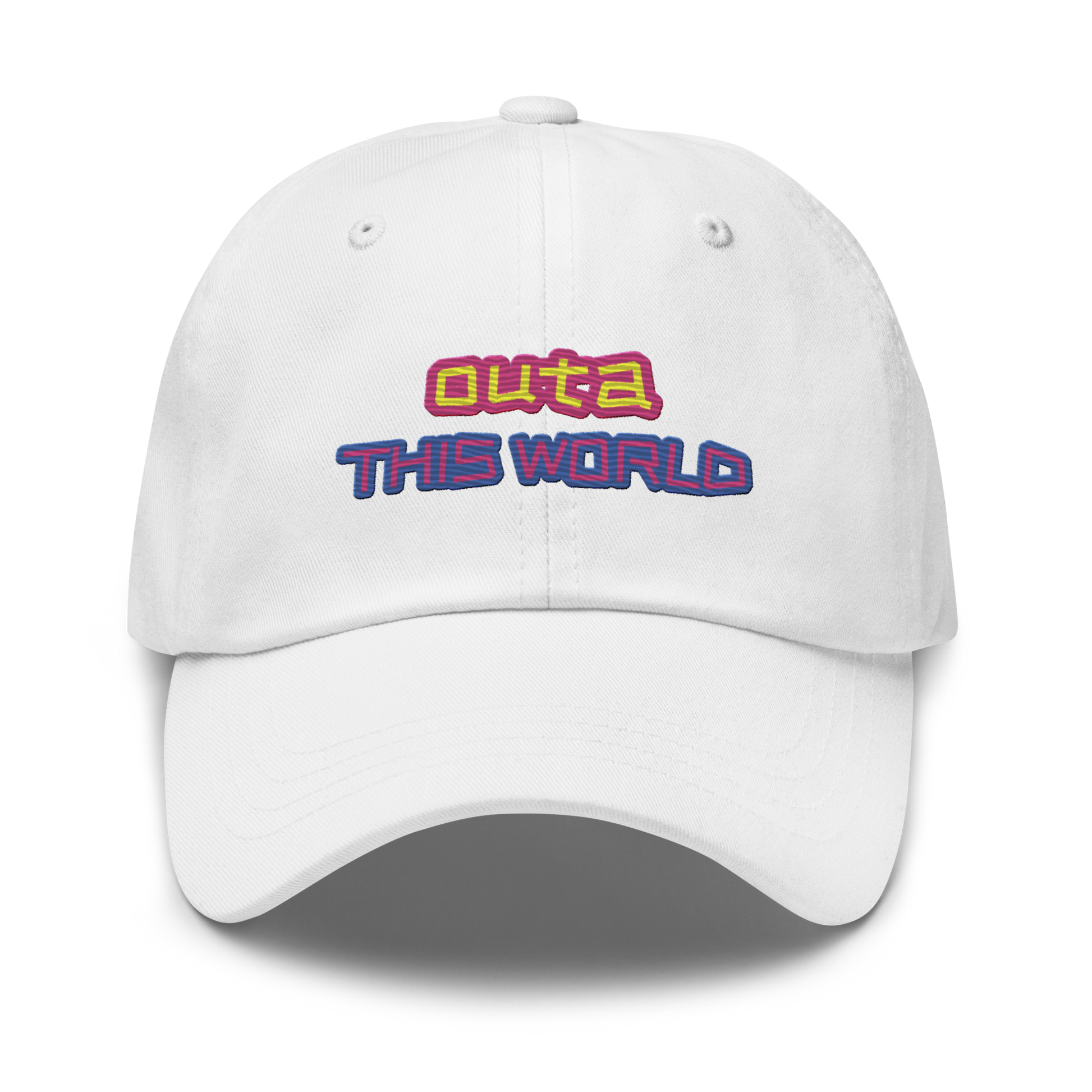 The "outa THIS WORLD" dad hat is not just for dads. This one's got a low profile with an adjustable strap and curved visor.